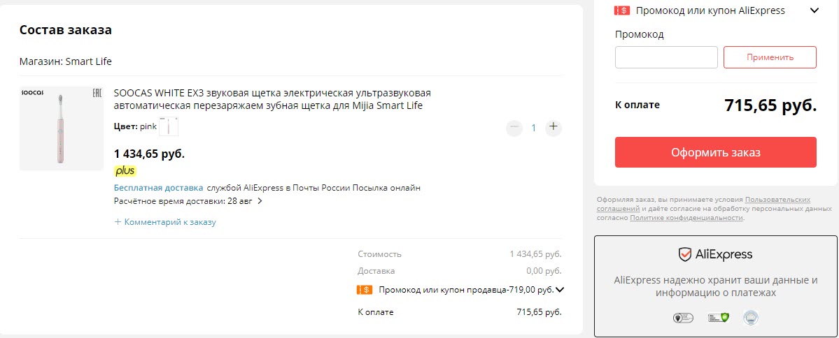 Электрическая зубная щётка SOOCAS WHITE EX3 розовая за 639₽. Чуть дороже есть на AliExpress Tmall за 716₽ с купоном на 719₽ от 1400₽. Отличная и недорогая зубная щётка, имеет влагозащиту IPX7, 3 режима работы и скорость 31000 пульсаций/мин. Время работы до 25 дней.
