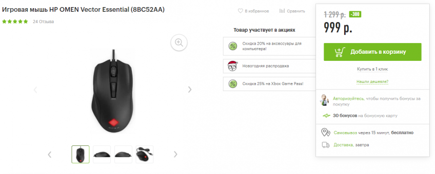 Игровая мышь HP OMEN Vector Essential (8BC52AA) за 696₽. Отличная цена на данную модель. В Эльдорадо за 999₽.