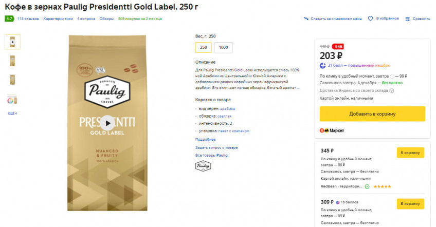 — Кофе в зёрнах Paulig Presidentti Gold Label, 250 г за 203₽ вместо 255₽.