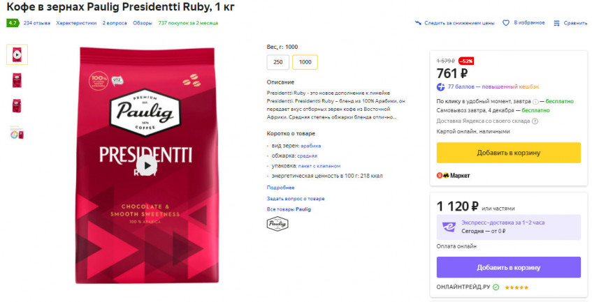 — Кофе в зёрнах Paulig Presidentti Ruby, 1 кг за 761₽ вместо 850₽;