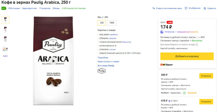 — Кофе в зёрнах Paulig Arabica, 250 г за 174₽ вместо 249₽;