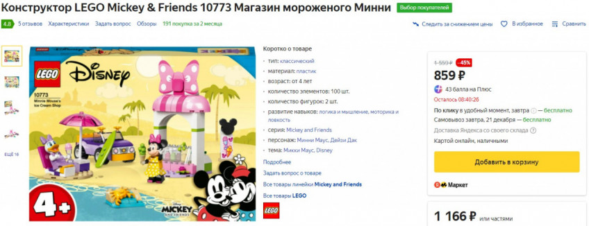 — LEGO Mickey & Friends 10773 Магазин мороженого Минни по цене 859₽, везде от 1199₽;
