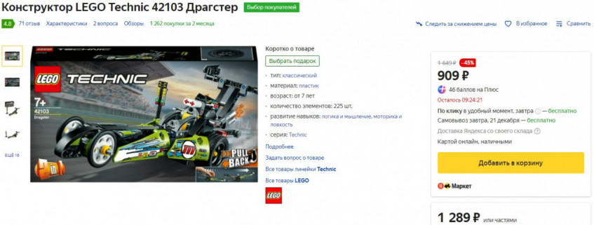 — Конструктор LEGO Technic 42103 Драгстер по цене 909₽, везде от 1229₽.
