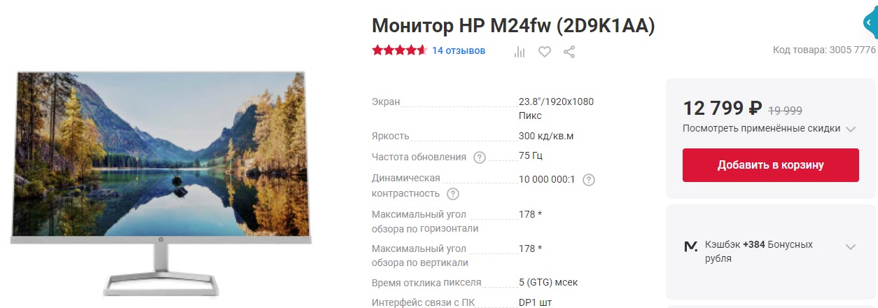 HP M24fw (2D9K1AA) такой же монитор с диагональю поменьше – за 12799₽. По такой же цене в Эльдорадо.