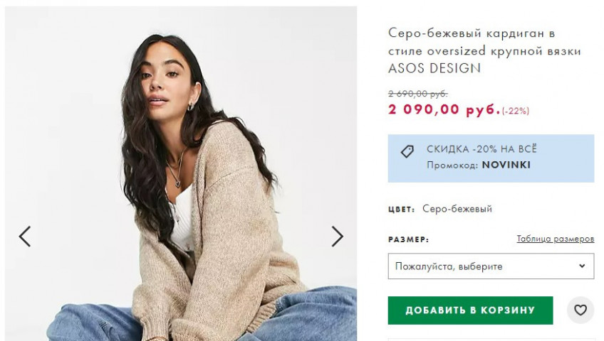 — Серо-бежевый кардиган в стиле oversized крупной вязки ASOS DESIGN по цене 1679₽, вместо 2690₽;