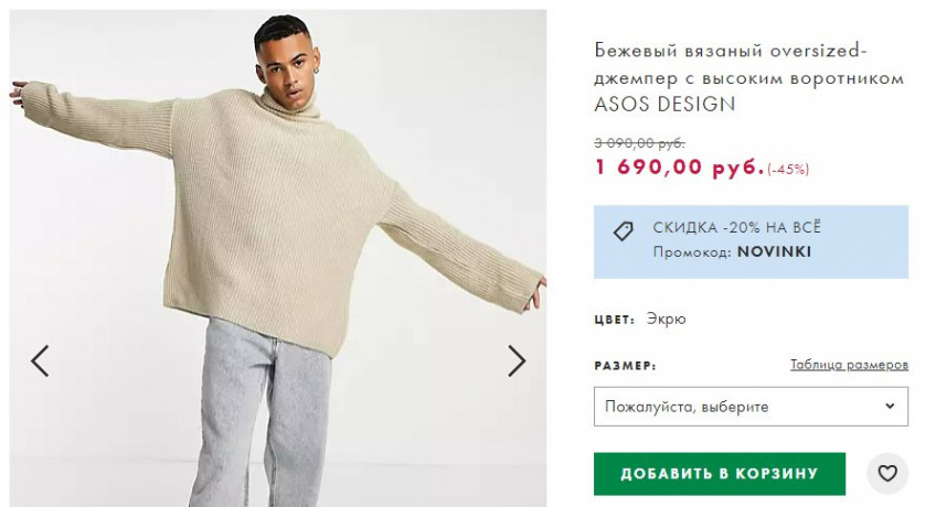— Мужской вязаный oversized-джемпер с высоким воротником ASOS DESIGN по цене 1352₽, вместо 3090₽;