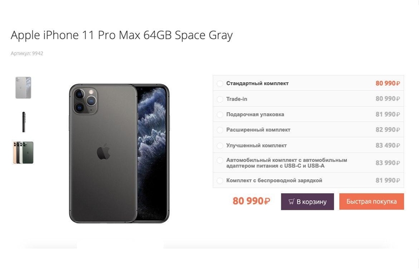 • iPhone 11 Pro Max 64GB за 80990₽, в других магазинах от 84980₽;