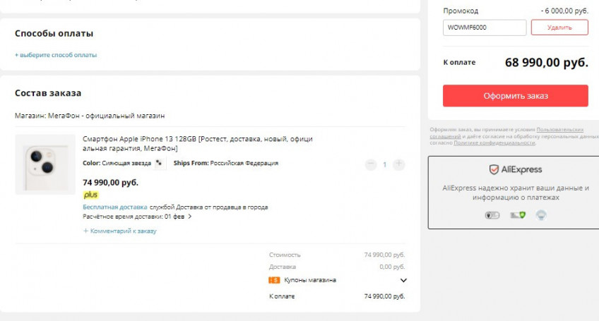 —смартфон Apple iPhone 13 128GB за 68990₽ с промокодом: WOWMF6000 вместо 74990₽.