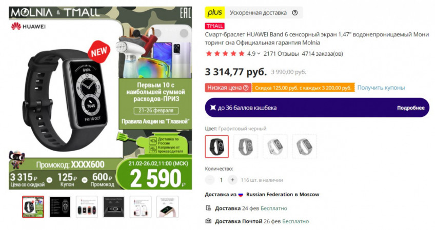- Смарт-браслет HUAWEI Band 6 с купоном на 125₽ и промокодом: XXXX600 на 600₽ за 2590₽, вместо 3990₽.