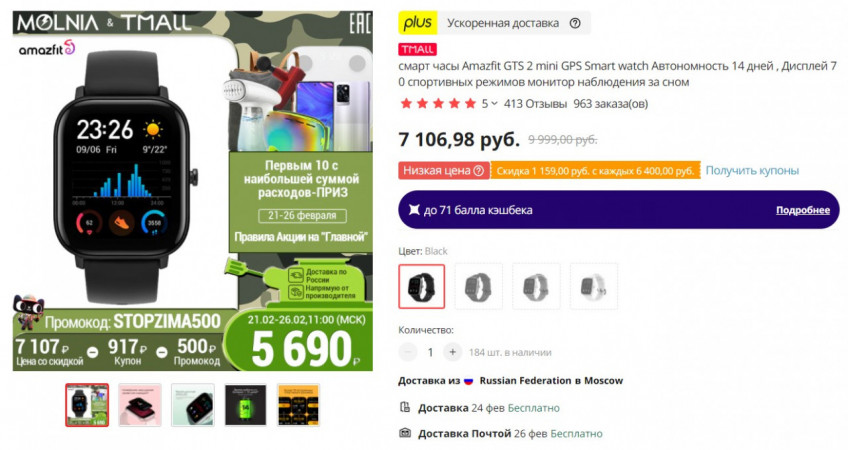- Смарт-часы Amazfit GTS 2 mini с купоном на 917₽ и промокодом: STOPZIMAI500 за 5690₽, вместо 9999₽;