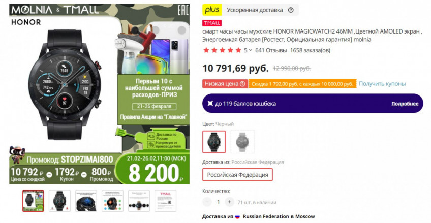- Смарт-часы HONOR MAGICWATCH2 46 мм с купоном на 1792₽ и промокодом: STOPZIMAI800 за 8200₽, вместо 12990₽;