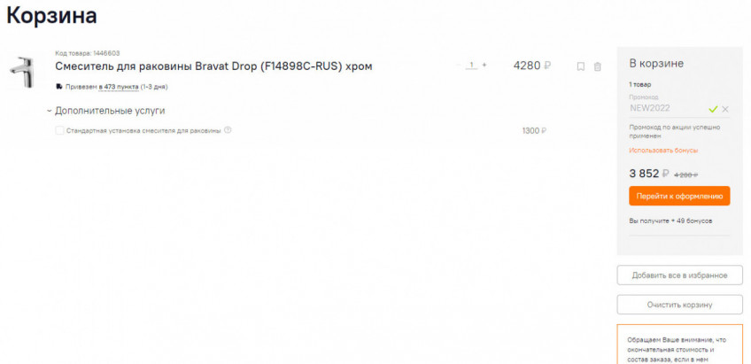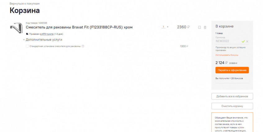 — Смеситель для раковины Bravat Fit F1233188CP-RUS хром за 2124₽ с промокодом: NEW2022 вместо 2399₽;