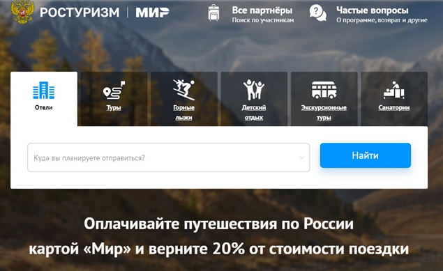 Кешбэк 20% от стоимости тура или брони отеля в России по карте МИР