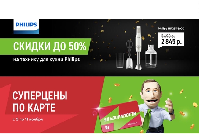 Эльдорадо тоже сегодня запустил новые акции! Максимальный размер скидок на полезные товары доходят до 50%.