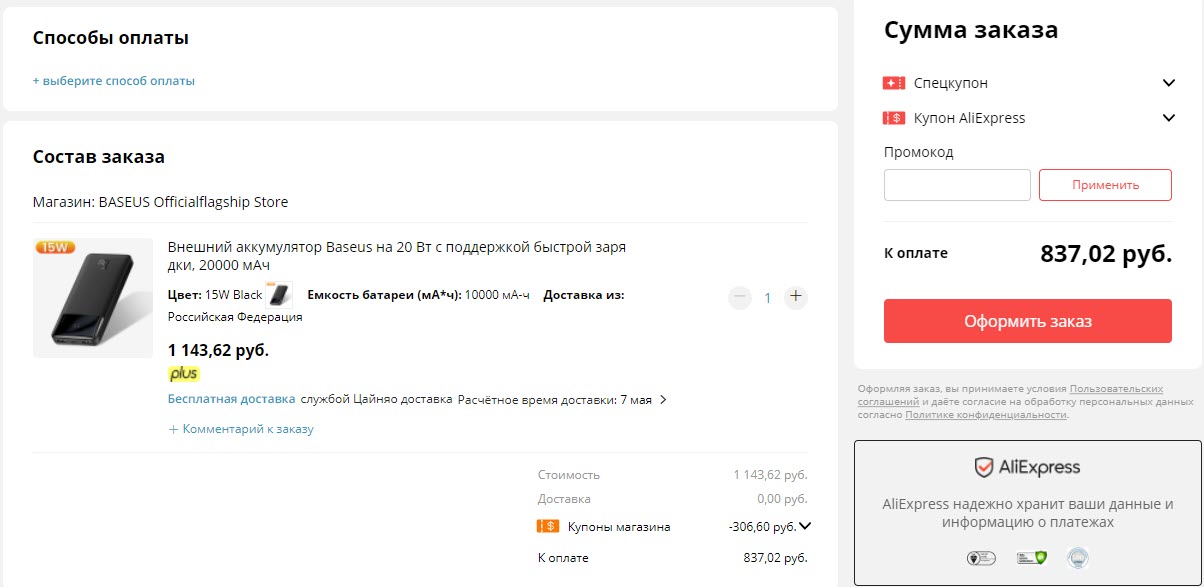 Там же можно выгодно приобрести внешний аккумулятор Baseus 10000 мАч 15 Вт за 837₽ с купоном продавца на 306₽.