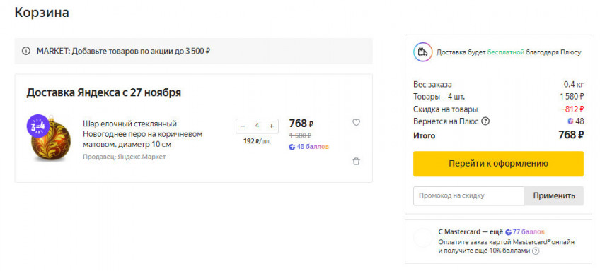 На Яндекс.Маркет проходит отличная акция 3=4 на ёлочные игрушки. Все товары сочетаются с промокодом: MARKET, который даёт скидку 10% на один заказ от 3500₽ и другими промокодами тоже. В наших примерах мы добавили 4 штуки одинаковых товаров, но вы можете набирать разные.